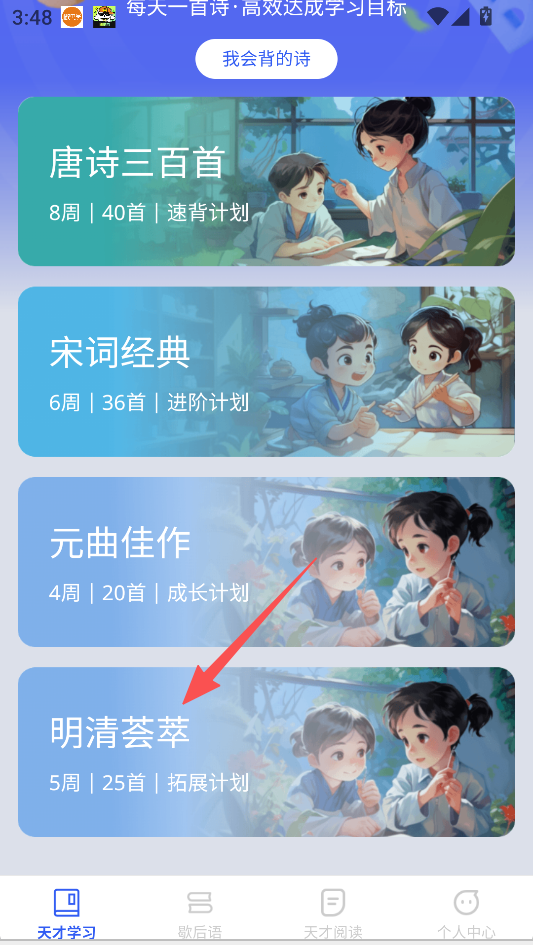 《天才爱学习》是一款专注诗词学习的教育软件,涵盖唐诗、宋词、元曲、明清诗词等内容。有“唐诗三百首”“宋词经典”等不同学习计划,以周制定背诗计划,每周有具体背诵任务。界面清新,计划清晰,能帮助用户系统学习诗词,提升诗词积累与鉴赏能力。