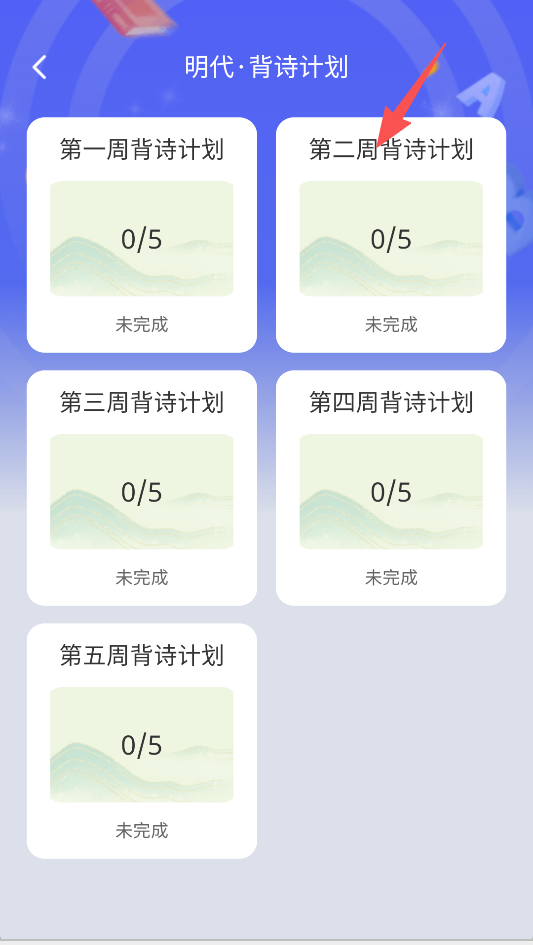 2、进入后,查看各周背诗计划,选择“第二周背诗计划”。
