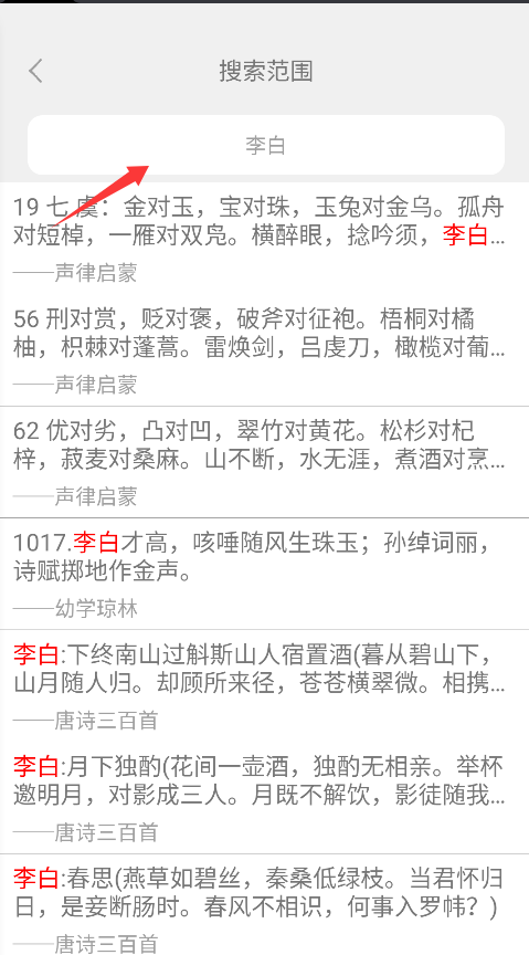 2、 在搜索页顶部的空白输入栏中,通过键盘输入“李白”二字,页面随即动态显示与关键词匹配的诗人、诗作列表。