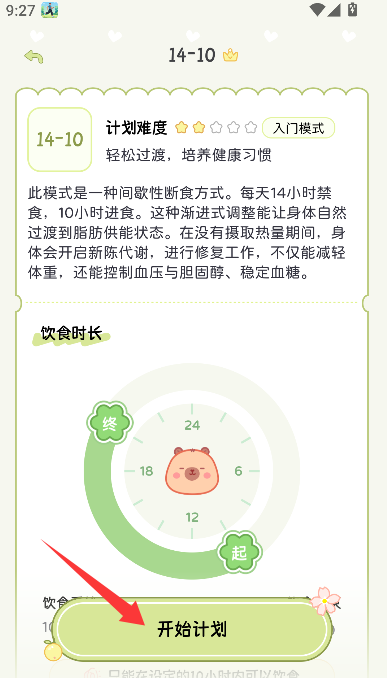 3、点击页面下方的"开始计划"主操作按钮,系统将自动跳转至带有计时功能的饮食执行界面。