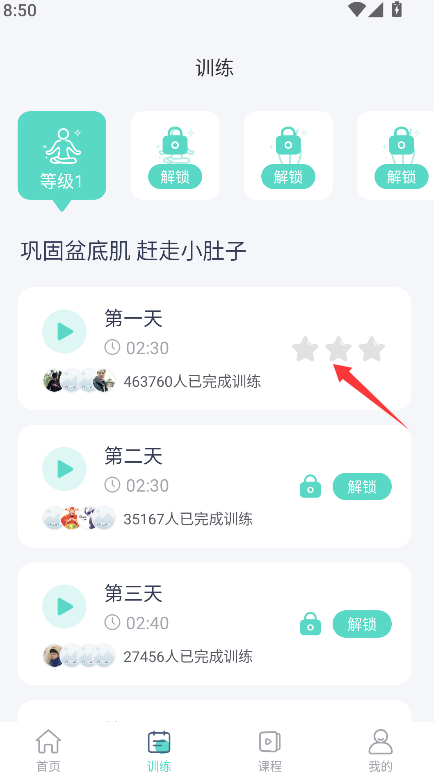 2、在训练计划页面中,浏览并选择标记为“第一天”的训练课程,轻触该课程卡片以进入详细内容。