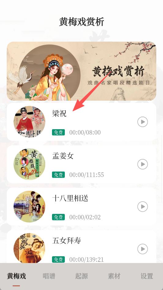 1、在黄梅戏赏析页面,点击《梁祝》等曲目,进入音频播放页。