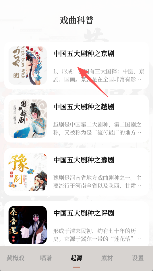 3、点击起源,浏览中国五大剧种等戏曲科普内容。