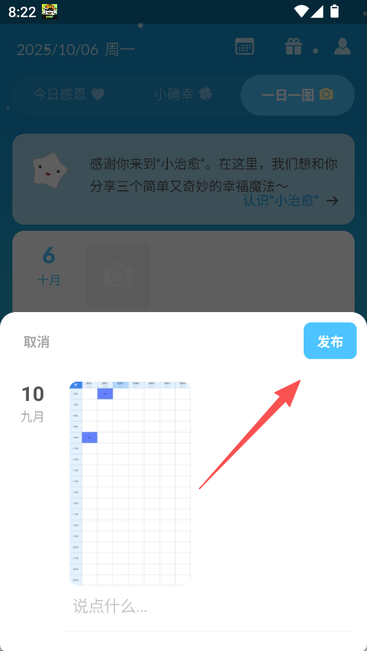 3、在编辑页面,可输入文字,完成后点击发布,记录幸福时刻。