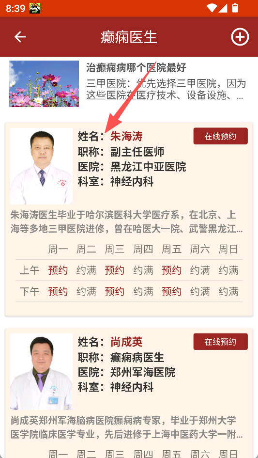1、点击“医生”,可查看癫痫医生信息,选择医生进行在线预约。