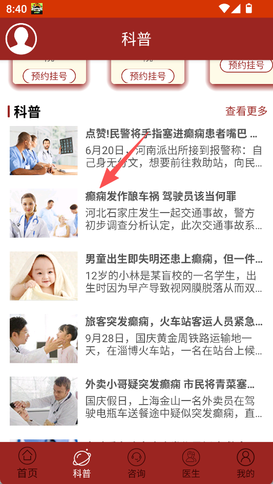 2、进入“科普”,浏览癫痫相关科普内容,选择感兴趣的科普文章进入详情页。