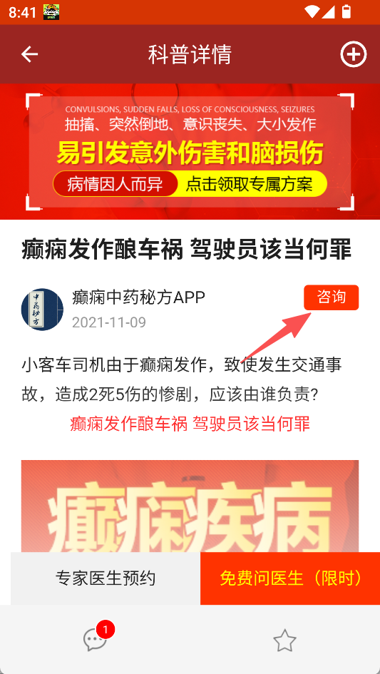 3、在科普详情页,可点击“咨询”,与相关人员交流,也能进行专家医生预约或免费问医生。