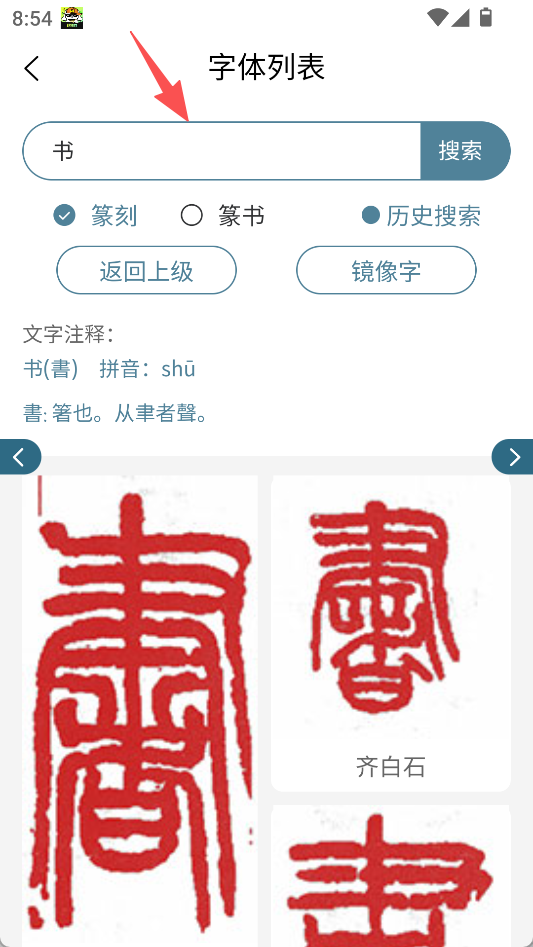 1、支持汉字搜索,输入汉字选择类别后,可得到对应的篆刻或篆书字体及相关信息。