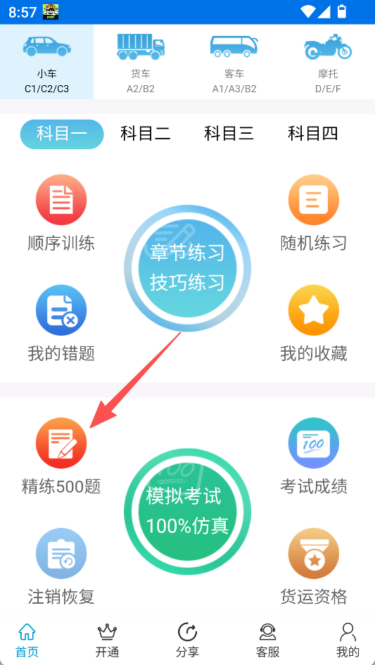 1、打开软件,在首页选择对应车型,点击“精练500题”。