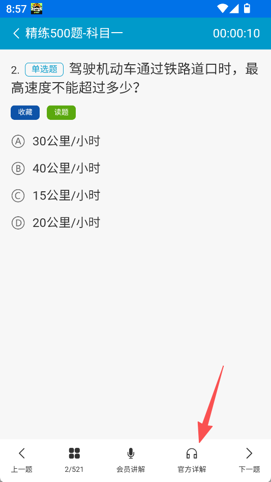 2、题目配备官方详解,能深入解析知识点,帮助理解题目背后的驾考知识。