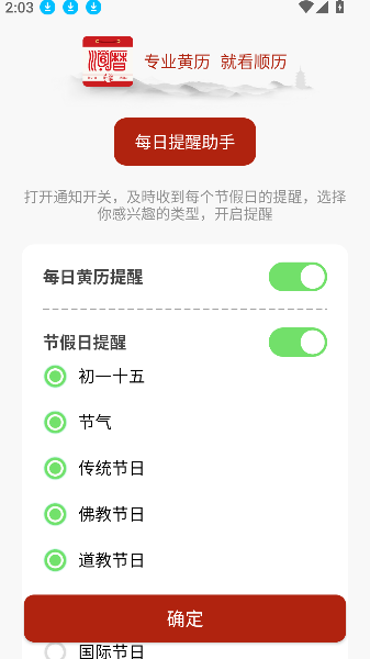 1、开启应用的消息通知功能,即可在法定节假日前及时收到提醒,并能根据个人需要选择关注的节日类型。