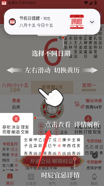 2、在日历界面中,通过向左或向右滑动屏幕,可以便捷地切换日期并查看对应日子的传统黄历信息。