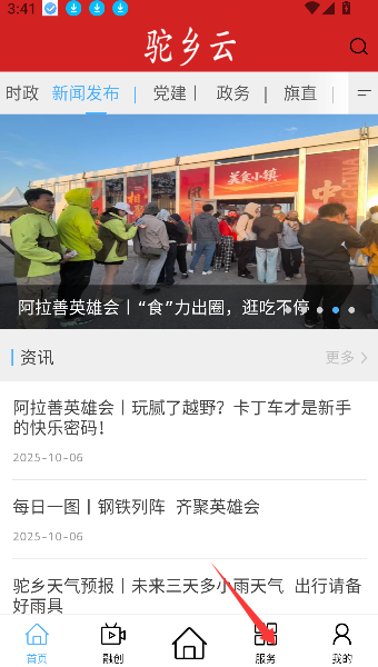 1、打开驼乡云软件,在首页下方找到并点击“服务”栏目,即可进入功能服务列表页面。