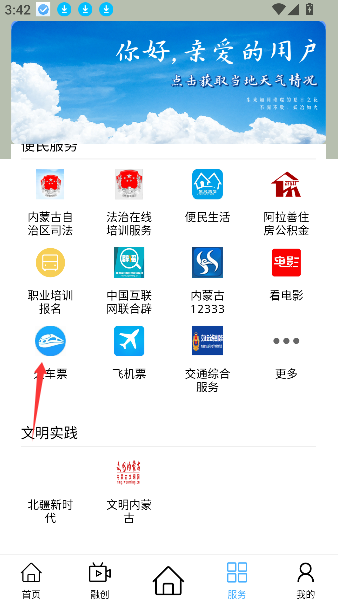 2、在服务列表页面中,选择并点击“火车票”功能选项,页面将跳转至车票查询与购买界面。