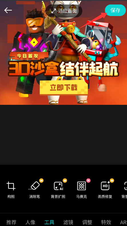 3、系统自动消除所选区域内容使画面整洁,最后点击保存图标即可将处理完成的图片导出至相册。