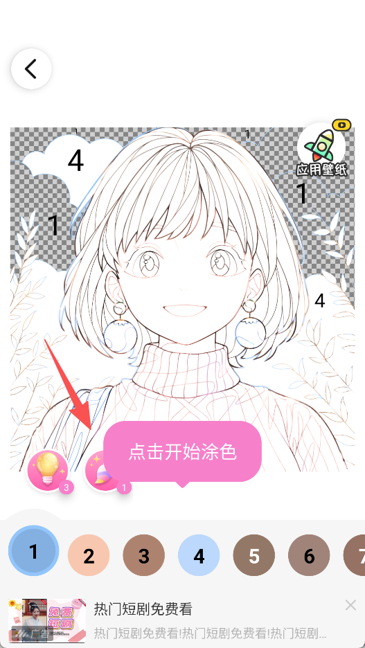 2、进入涂色界面,点击“开始涂色”,按数字提示为线稿填色。