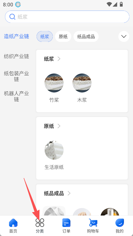 1、打开软件,进入分类板块,选择造纸产业链等分类查找商品。