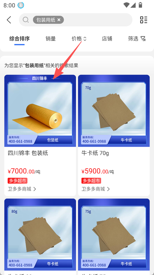 2、搜索商品关键词,在结果页可按销量、价格等排序,挑选心仪商品。