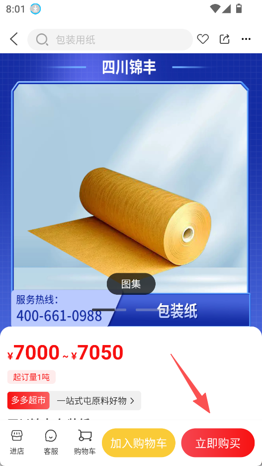 3、进入商品详情页,可查看图集、价格等,点击加入购物车或立即购买。