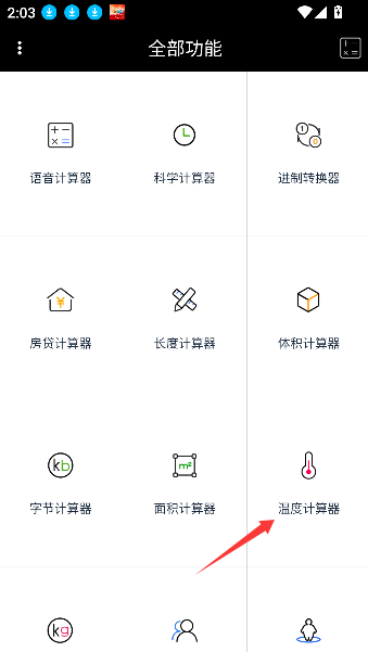 2、在全部工具或功能列表页面中,浏览并选择标有“温度计算器”字样的功能选项,点击进入。