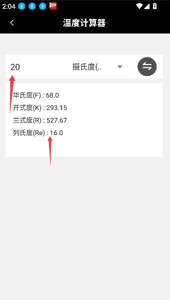 3、点击后页面下方将展开一个转换界面,显示摄氏度、华氏度等不同温度单位之间的实时换算结果。