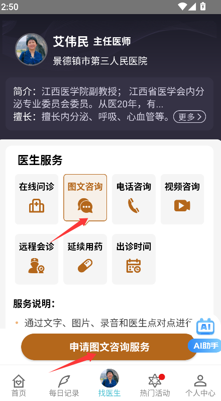 2、在列出的医生服务项目中,根据个人需求选择一种合适的咨询方式。