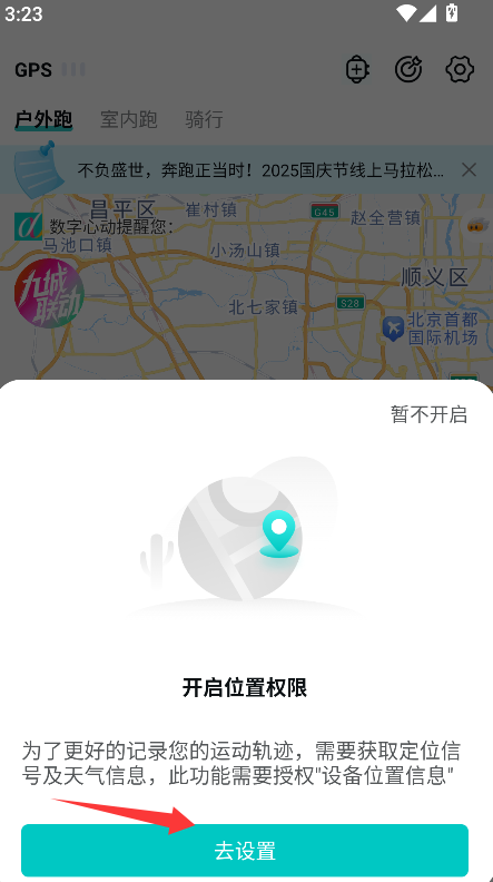 2、弹出请求开启位置权限的提示窗,需点击窗内的“去设置”按钮,跳转至系统设置完成授权操作。
