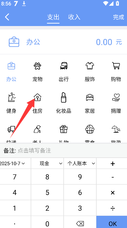 2、首先根据当前记录的是支出还是收入,在提供的分类图标中选择对应的项目。