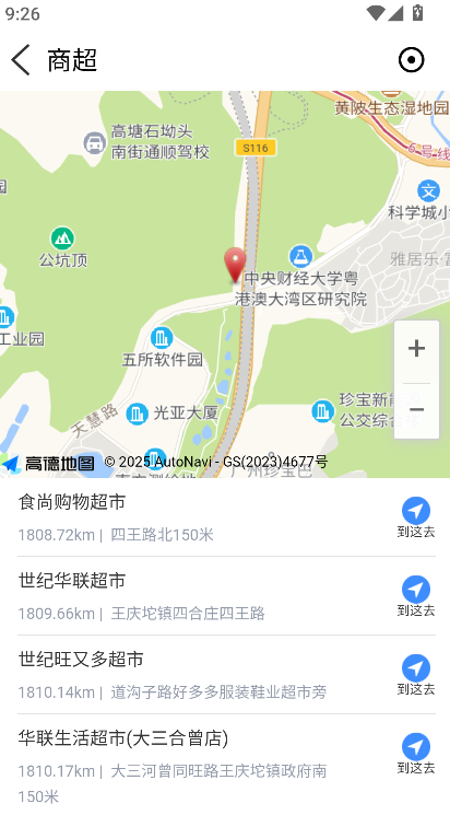 3、完成服务选择后,系统将自动基于当前位置信息,筛选并列表显示周边可供选择的相关服务商户(例如超市)。