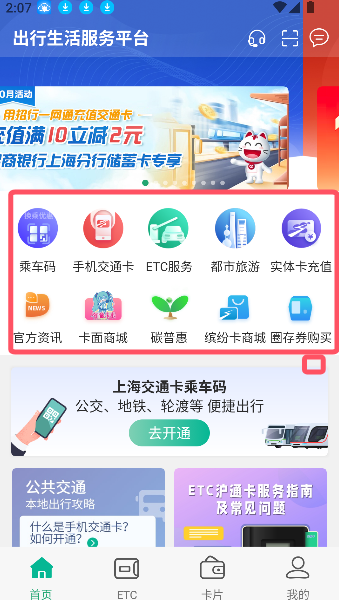 1、打开软件进入首页,即可看到乘车码、手机交通卡以及都市旅游等核心服务入口。