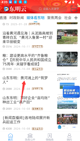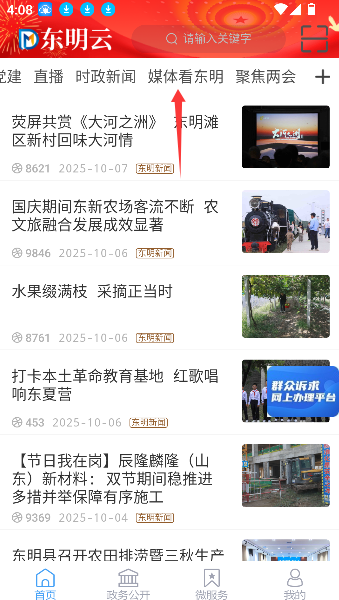 1、登录软件进入主界面,在首页醒目位置找到并点击“媒体看东明”栏目入口。