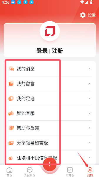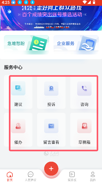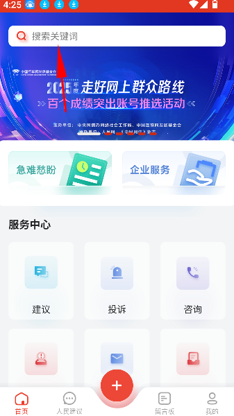 1、打开软件进入首页,可以看到提供建议、进行投诉或发起咨询等核心功能的入口。