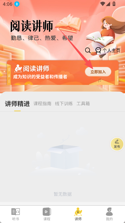 2、切换到讲师板块,点击立即加入,成为知识传播者。