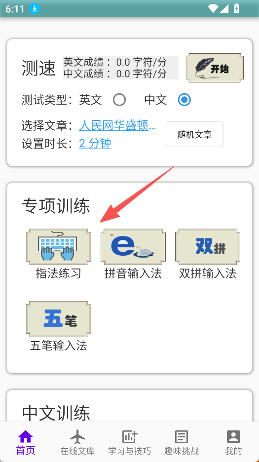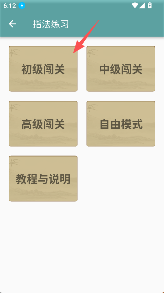 2、进入指法练习页面,挑选“初级闯关”等模式开始练习。