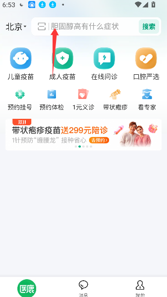 1、打开医鹿阿里健康应用进入首页,在页面顶部找到并点击醒目的搜索框入口。