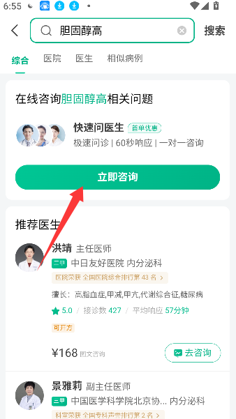 3、进入搜索结果页后,可直接点击“立即咨询”快速提问,也能浏览并选择系统推荐的医生进行详细咨询。