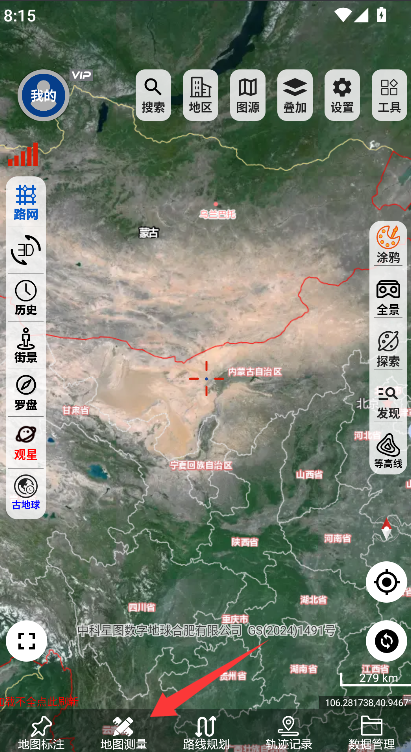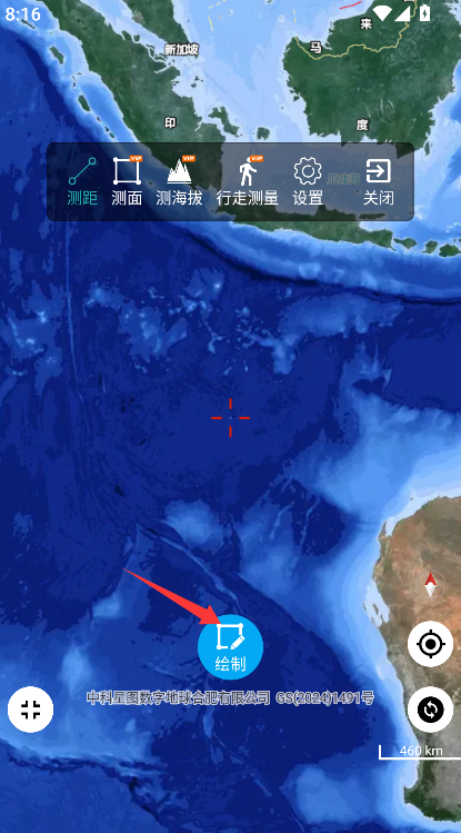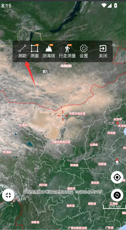 2、点击“测距”选项,界面将切换至测距模式,允许在地图上进行点与点之间的连线绘制。
