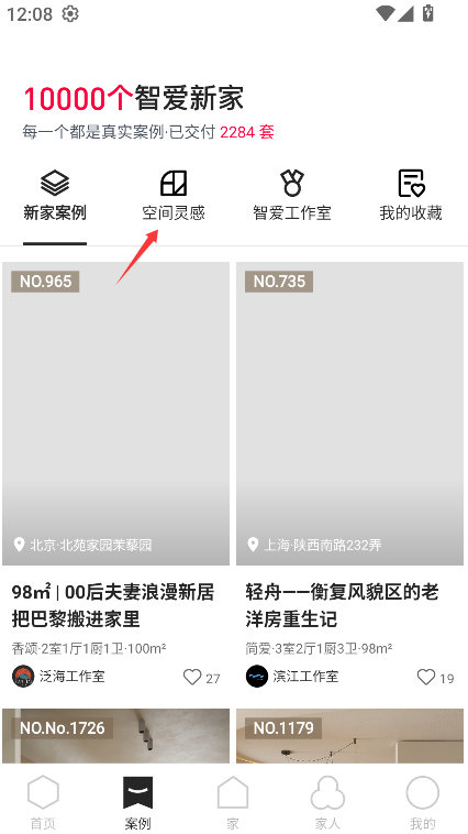 2、浏览并选择“空间灵感”这一分类选项,即可浏览按不同功能区域(如卧室、厨房)分类的装修案例集合。