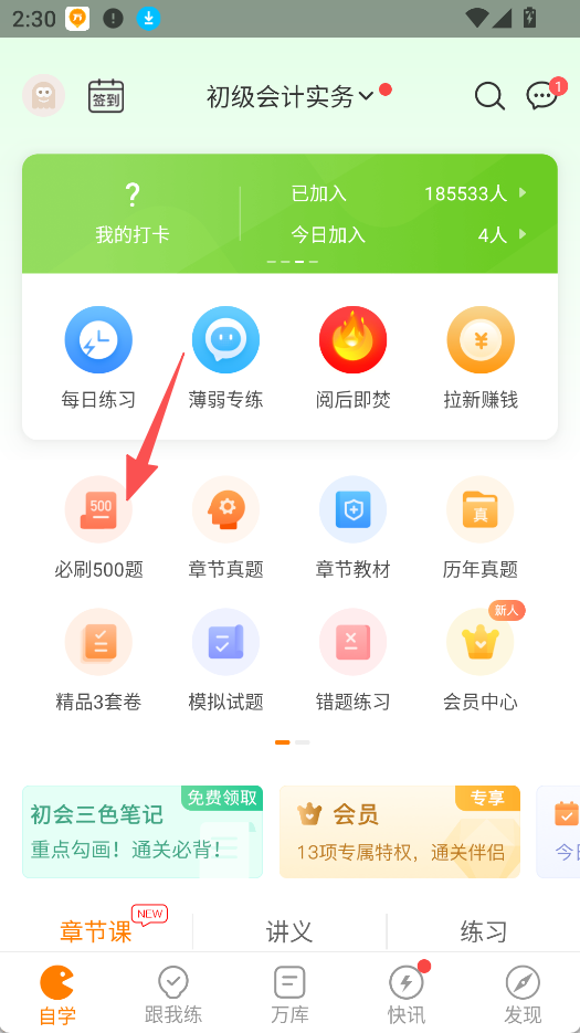 2、具备多种练习类型,有必刷500题、章节真题、模拟试题等不同类型的练习可供选择。