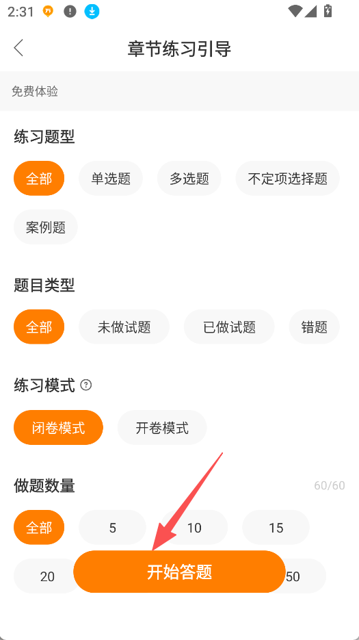 3、支持练习参数设置,在章节练习引导页面,能设置练习题型、题目类型、练习模式和做题数量。