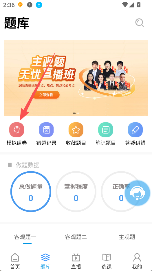 1、支持模拟组卷,进入题库页面点击 “模拟组卷”,可选择模拟考卷进行综合练习。