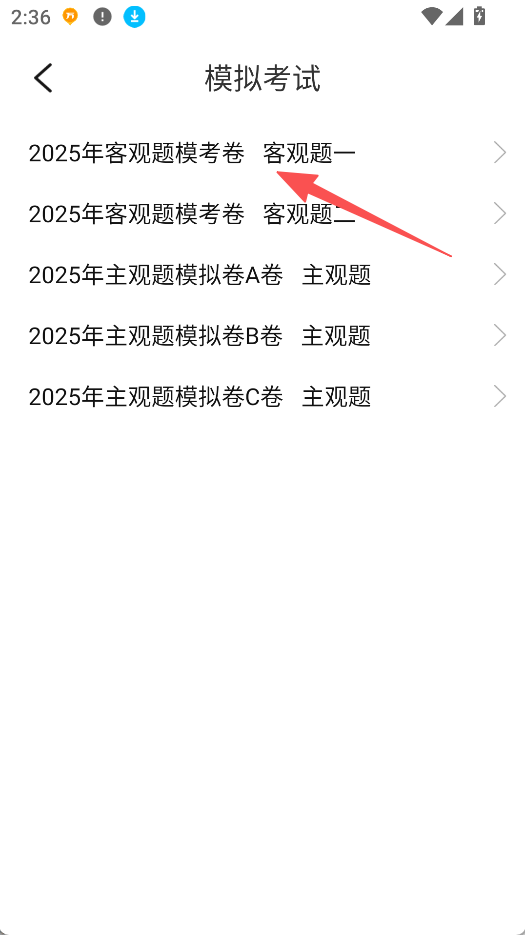 2、在模拟考试页面,选择要做的模拟考卷,如2025年客观题模考卷。