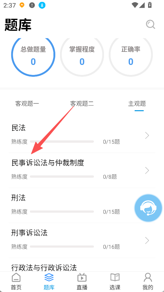 3、也可在题库页面,选择具体法律科目,如民事诉讼法与仲裁制度,进行专项练习。