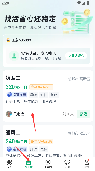 1、在首页或功能栏点击“找工作”入口,可浏览并筛选与自身专业技能相匹配的施工岗位信息。