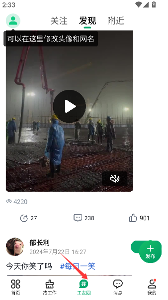 2、进入“工友圈”社区板块,能够发布动态、查看同行分享并参与各类专业话题的交流讨论。