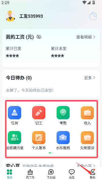3、点击底部导航“我的”页面,其中集中展示个人任务列表、每日记工数据及收入明细等信息。