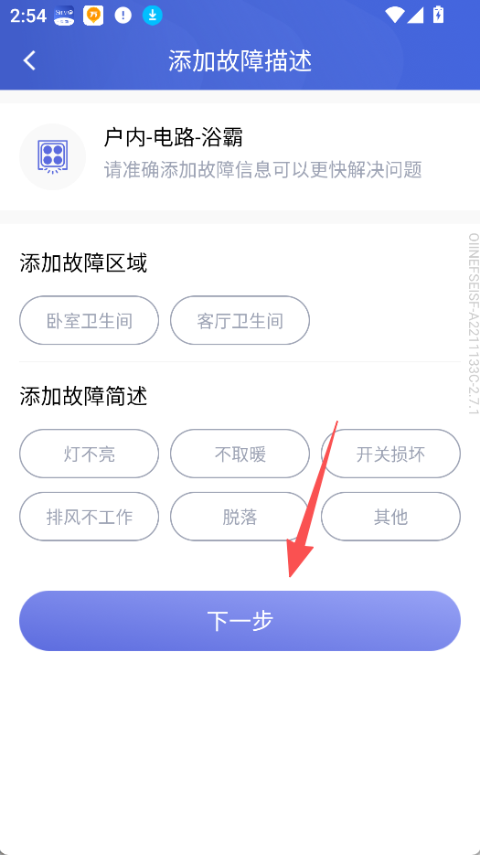3、需要报修时,选择故障区域和简述故障,点击下一步完成报修流程。