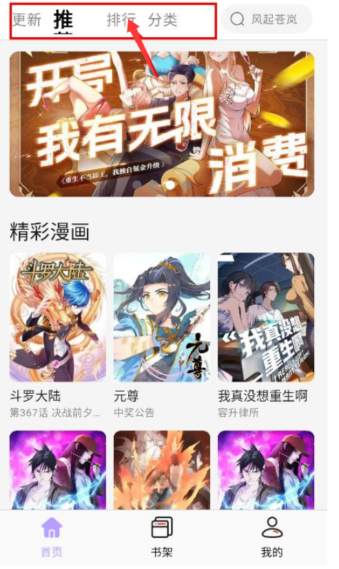 1、找到并点击“排行”功能入口,即可进入全站漫画排行榜页面。