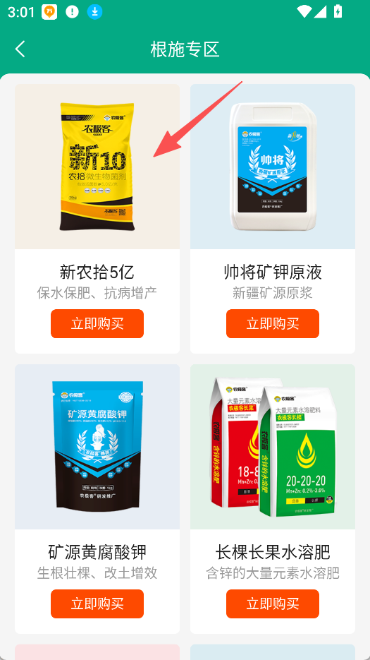 1、打开《农极客》,进入根施专区,选择想要的农资产品。