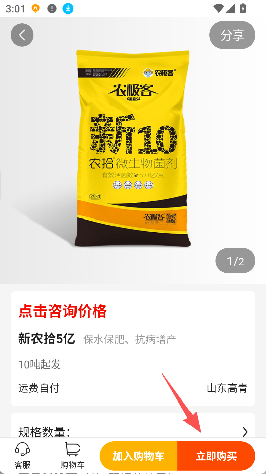 2、支持农资购买,点击产品后可选择“立即购买”或“加入购物车”完成农资采购操作。